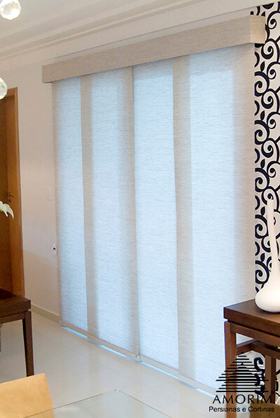 Com um design arrojado, a cortina painel permite uma abertura lateral ou bilateral, sendo uma solução indicada para vãos de passagem e grandes espaços por permitirem a rolagem do tecido em trilhos. Produzida em tecidos translúcidos, fibras naturais ou blackout, a cortina painel possui uma estrutura encorpada como uma lona